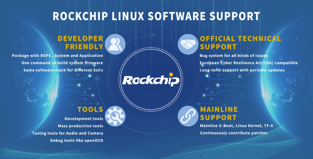 三、全面軟件保障,豐富生態(tài)資源匹配針對(duì)工業(yè)場(chǎng)景智能化,瑞芯微提供全面軟件保障支持,主流芯片平臺(tái)持續(xù)更新適配最新Linux及Android系統(tǒng)版本,為全球開(kāi)發(fā)者提供 BSP、系統(tǒng)與應(yīng)用一體化軟件包,各領(lǐng)域合作伙伴及開(kāi)發(fā)者均可在瑞芯微官方平臺(tái)獲得全類型問(wèn)題的技術(shù)支持以及各類開(kāi)發(fā)調(diào)試工具。在安全支持方面,瑞芯微提供全鏈路的安全啟動(dòng)SecureBoot、Trustzone、加解密引擎等全面的安全保障機(jī)制,防止固件完整性被篡改。
