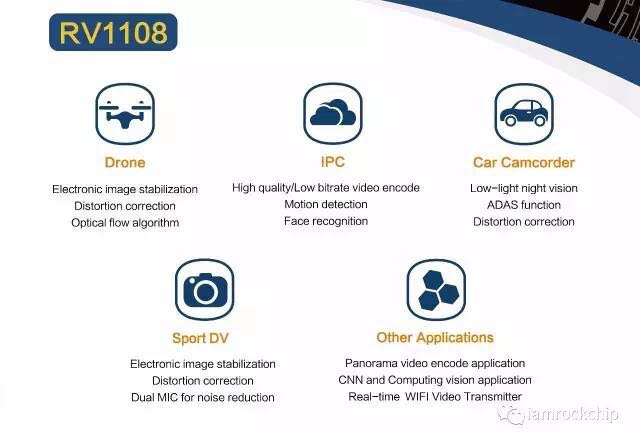 During CES, Rockchip has showed many IoT application terminals based on RV1108, including DRV smart rearview mirror, sport DV, VR panoramic camera, IP Camera, drones etc...